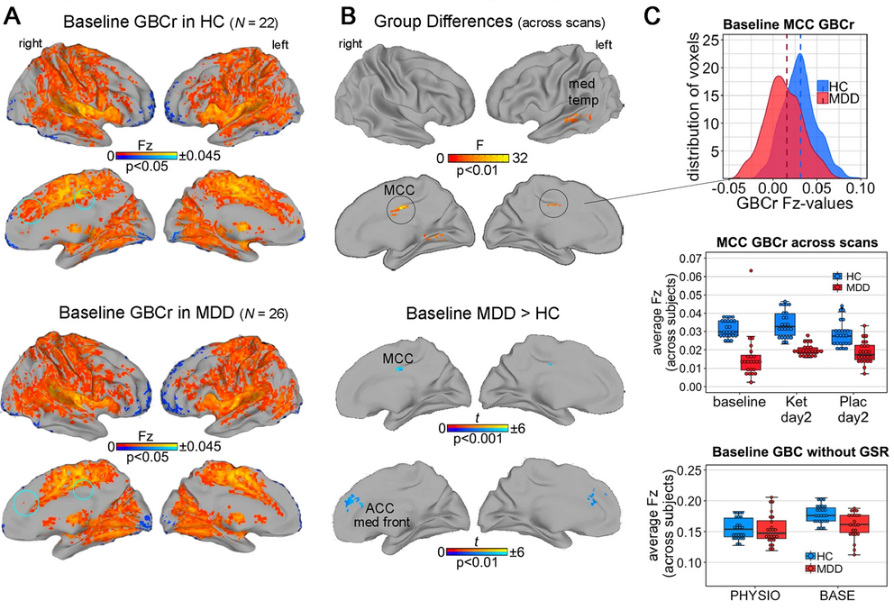 Previous studies found that antidepressant treatment with ketamine normalized aberrant GBC changes in the prefrontal and cingulate cortices, warranting further investigations of GBC as a putative imaging marker. These results were obtained via global signal regression (GSR). This study is an independent replication of that analysis using a separate dataset. Reduced GBC was observed in individuals with MDD only at baseline in the anterior and medial cingulate cortices, as well as in the prefrontal cortex only after regressing the global signal. This underlines that resting state fMRI based connectivity measures are very attractive for future disease marker applications, yet have to undergo further development until they are ready for prime time clinical applications.