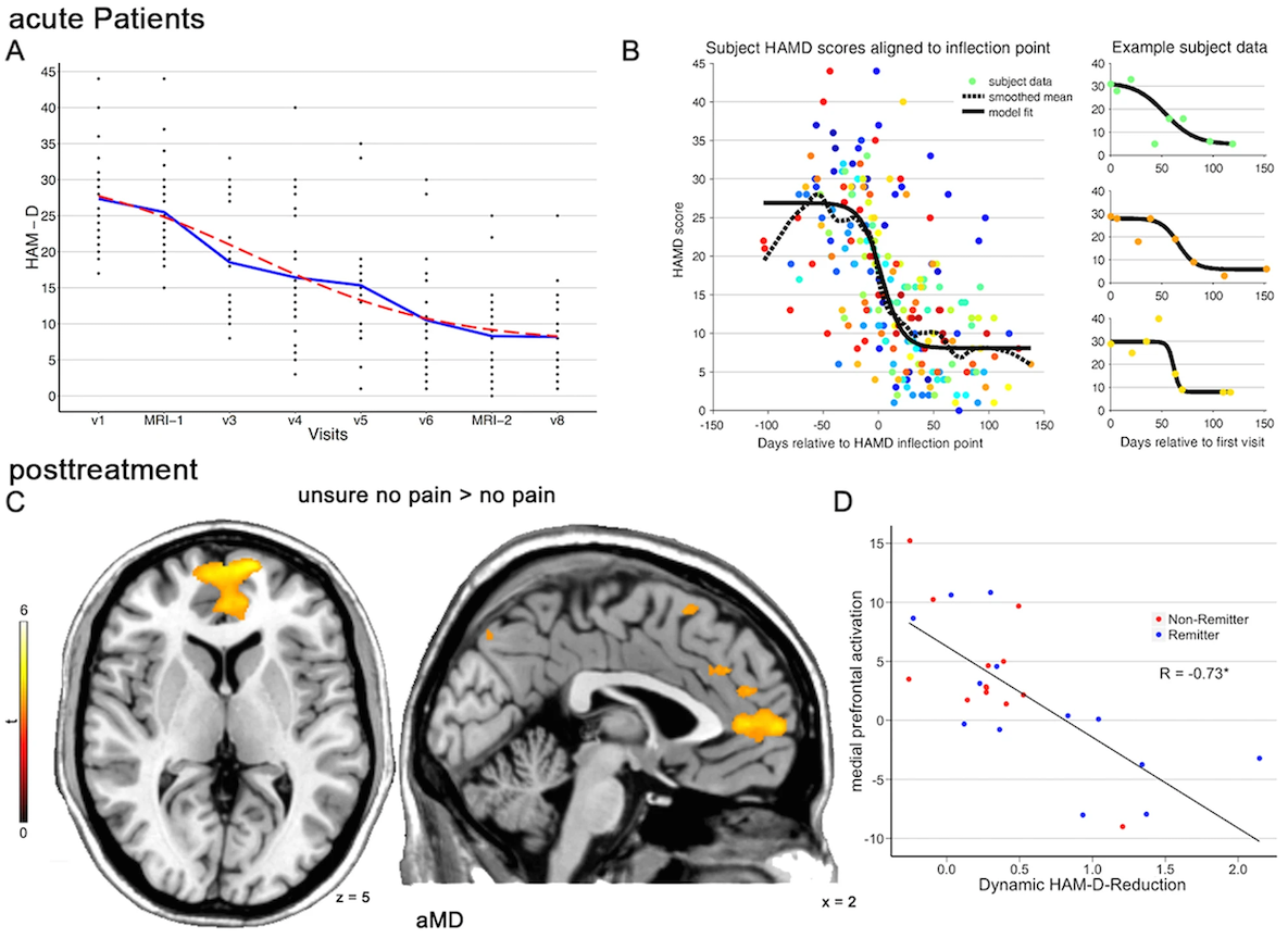 The project aimed to identify biological and imaging parameters for major depressive disorders and to identify predictive markers for treatment response by using a multimodal, interdisciplinary and translational research approach. We aimed to detect neuronal correlates of response and remission in an antidepressant treatment study with 7 T structural and functional MRI, potentially harnessing advances in detection power and spatial specificity. We optimized response assessment by modeling the dynamic speed of response using a sigmoidal model with fMRI-data and corroborated the importance of anterior cingulate function in remission. Moreover, our results hint towards temporoparietal junction activity as a potential correlate of non-remission, but confirmation is needed.